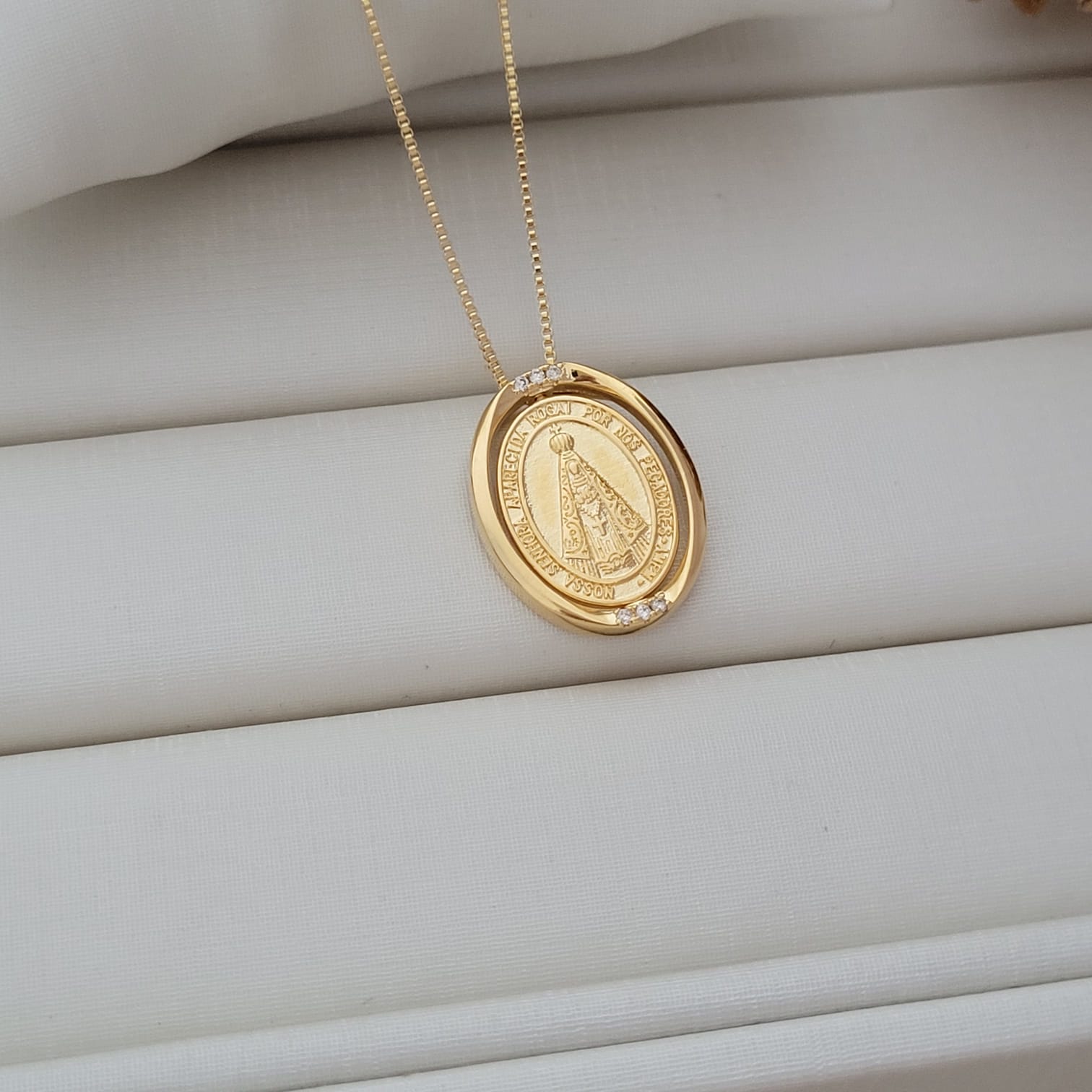 O Colar Nossa Senhora Aparecida retrata a imagem da santa com graciosidade e devoção. Este colar é uma escolha encantadora para quem deseja carregar a proteção e a bênção da Santa, combinando elegância e fé.