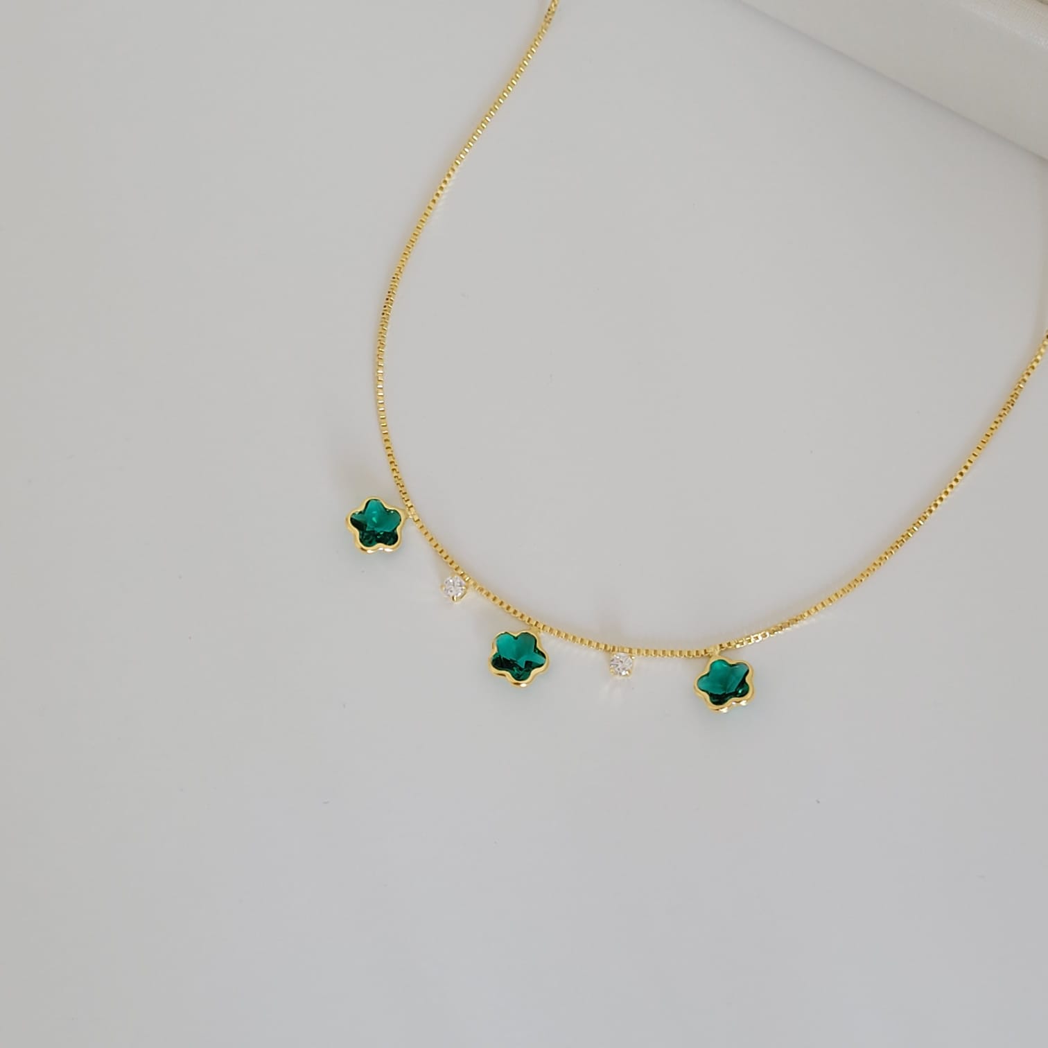 O Colar Trevo Verde Esmeralda é uma peça delicada, cheia de elegância e significado. Ele combina o brilho do banho do ouro com o tom vibrante e sofisticado do verde esmeralda, proporcionando um visual único.